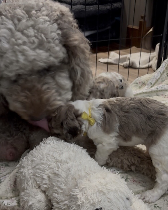 Nova’s sweet babies are now five weeks old and have developed from helpless newborn puppies to the “mini dogs” they are today. The puppies are now awake for more extended periods and enjoy playing with each other, their toys, and cuddle time. We are starting to see their personalities develop.