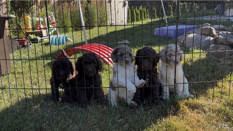 It is important when raising puppies to socialize them, which means introducing them to as many new experiences as possible when they are young. The puppies have been introduced to different floor surfaces, new toys, our other adult dogs and Paisley, our eleven-week-old puppy. The puppies continue to get lots of interaction with humans of all ages.
