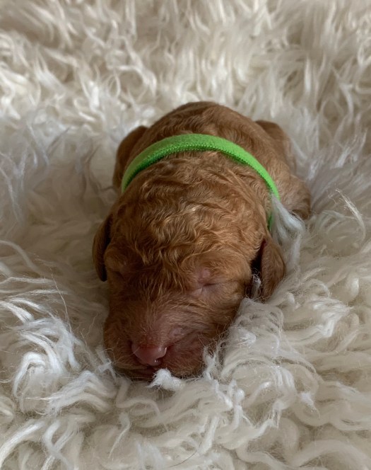 After the newborn puppy has nursed, we then towel dry them, examine them,weigh them, and record their birth weight. Finally we put collars on – a different colour for each puppy – to keep track of their progress in the coming days and weeks.