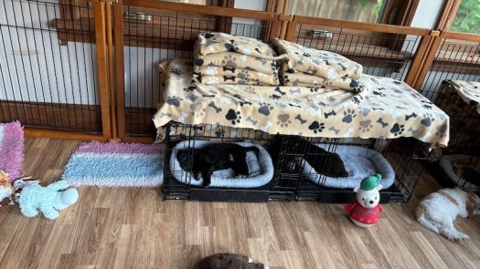 This week, we said goodbye to the whelping box and started crate training in a new puppy area. I start the puppies with a few crates, leaving the door open. This is the beginning of crate training. The puppies go in on their own to explore, and the door is always open.