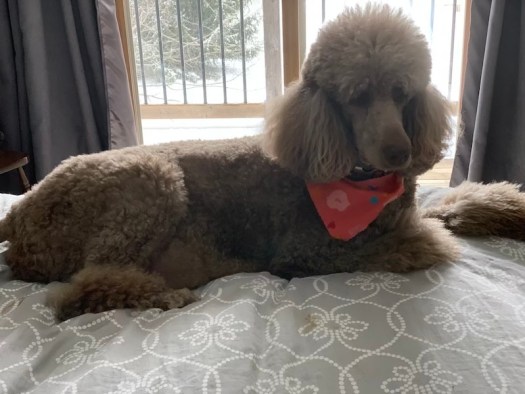Willow and Ellie are the best of friends and have kept each other company throughout their pregnancies but, since Willow had her puppies, she became a protective mama and wouldn’t let any of our dogs in her room. But today Willow let Ellie come into our bedroom to see her puppies. Ellie happily spent the day relaxing on my bed and getting lots of rest. Ellies’ due date is March 13th (Day 63) – Just two days away! The puppies can arrive a few days early or a few days late. Either way, Ellie will soon have a whelping box full of her own babies to care for.