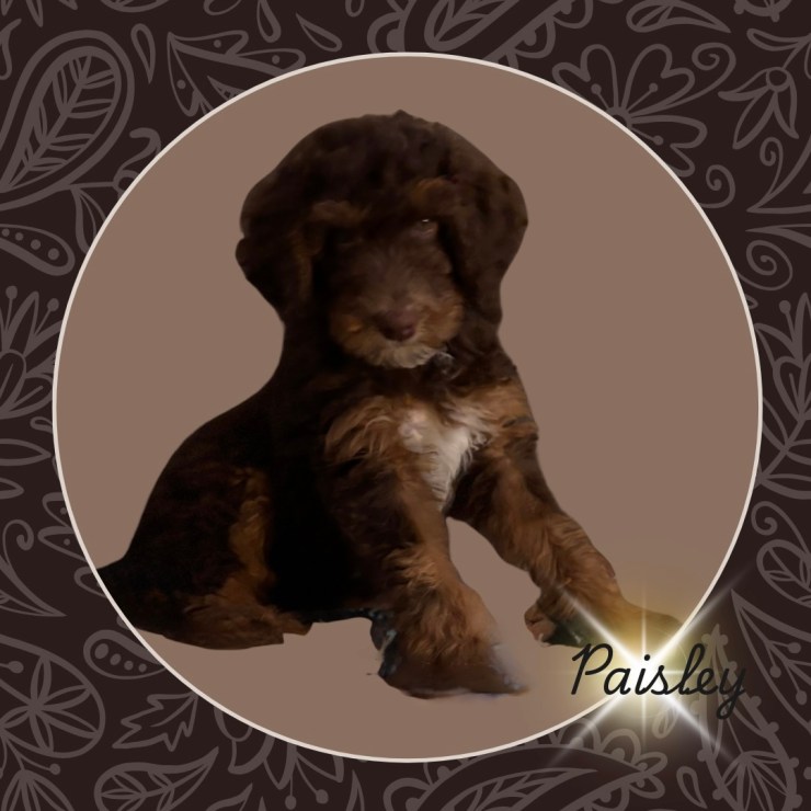 Paisley is a brown tri-colour phantom standard goldendoodle with an expected adult weight of 50 to 55 pounds. She was born on April 24, 2025, and is currently in our training program where she is learning to walk on a leash and basic dog commands. Paisley is working on potty training and is fully crate trained. She sleeps in her crate overnight for eight hours