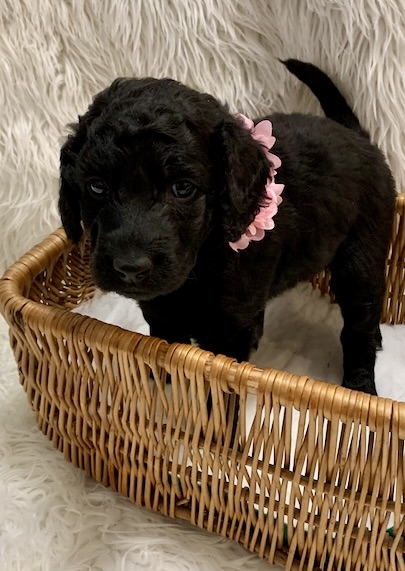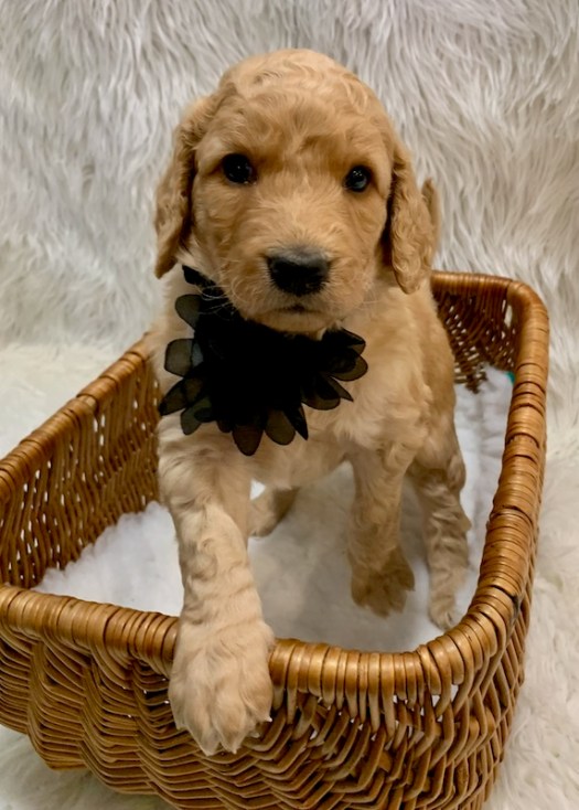 It is always a challenge to take puppy pictures and today was no exception. During the photo shoot I took over 300 pics. Those beautiful little puppies just wanted to come see me and explore. After seven puppies my patience was wearing thin. I took the last puppy, Yellow Collar Girl out of the whelping box, put her flower on and put her in the basket. She did the usual, walked around and sniffed the basket. I readjusted her in the sitting position – she stayed sitting and looked directly at me while I snapped a few pics. It was that easy! Gold Star for our Yellow Collar Girl – what a good girl!