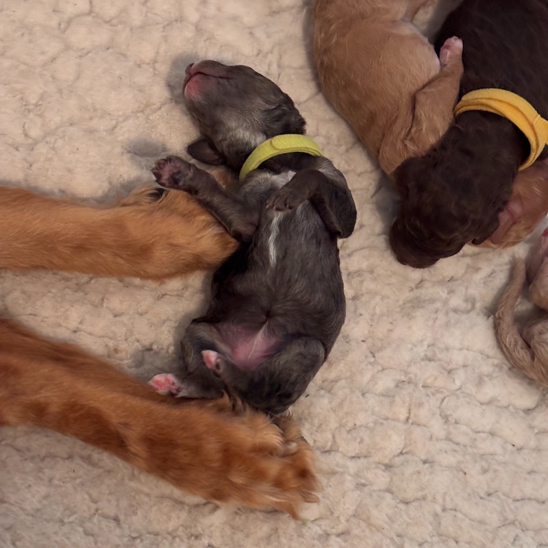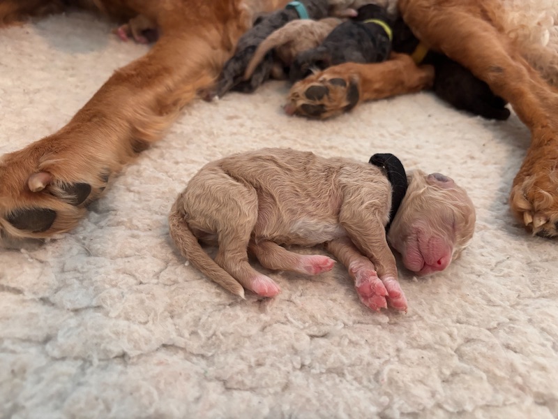 We usually begin our ENS exercises on day three and continue through day 16. Through ENS, we introduce little stress to the puppies, which has been proven to produce calmer puppies. It also produces greater tolerance to stress, greater resistance to disease, a faster adrenal system, and stronger heart rates and heartbeats. Because the puppies were slow to gain weight and many puppies were being supplemented with puppy formula, I didn’t want to put more stress on the litter, so I held off on starting ENS until day five. We will continue until the puppies are sixteen days old.