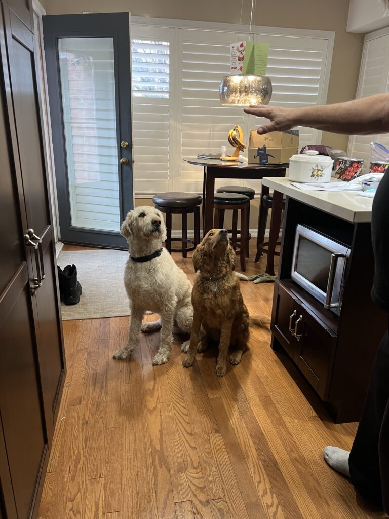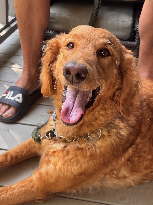 Millie is a beautiful Red Flat Coat Standard Goldendoodle—Purple Collar Girl from Ellie and Brinkley’s 2023 litter. She looks just like her handsome daddy, Brinkley.