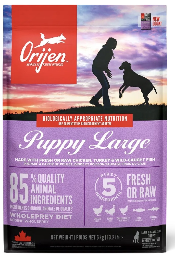 Food – Orijen Large Breed Puppy Food (Your take-home package will have five days of food.) This food is available in two sizes. To read about this high-quality food, follow the link: Orijen Puppy Food.