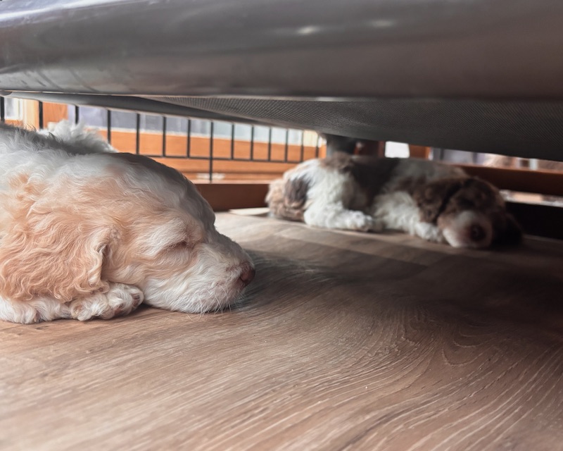 The puppies still sleep much of their time. This is when they grow and process what they have learned while awake. Remember the puppy huddles? Now that they are bigger and can regulate their temperature, some puppies sleep with a buddy, and some puppies sleep alone.
