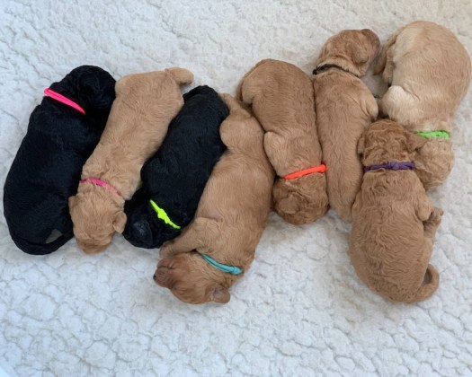 The puppies are in the Neonatal Period which is from day 0 to day 14. During this period, puppies spend their time eating and sleeping. On Monday, day 3, we began ENS exercises (Early Neurological Stimulation) which will continue through until day 16. We preform ENS daily during our weigh-in time. Research shows these tiny struggles and stresses in small doses are good for puppies. Research shows that benefits from ENS include greater tolerance to stress, greater resistance to disease, faster adrenal system, stronger heart rate and stronger heartbeat. This is a gift that a breeder can only give their puppies during the 3 to 16-day window.