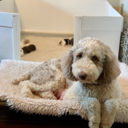 The puppies still require stimulation (lick) to void. Observe as Nova cleans each puppy before settling down to nurse.