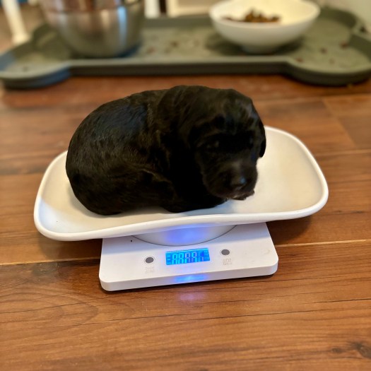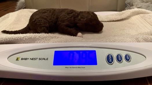 The puppies’ first milestone this week was doubling their birth weight. We pay close attention to this milestone because when a puppy isn’t gaining enough weight, it signals a potential issue. With Nova only having five puppies to feed, her pups gained weight more quickly than our larger litters. Three puppies—yellow, orange, and black—doubled their birth weight during the day seven weigh-in, while the other two puppies—pink and blue—achieved this milestone on day eight.