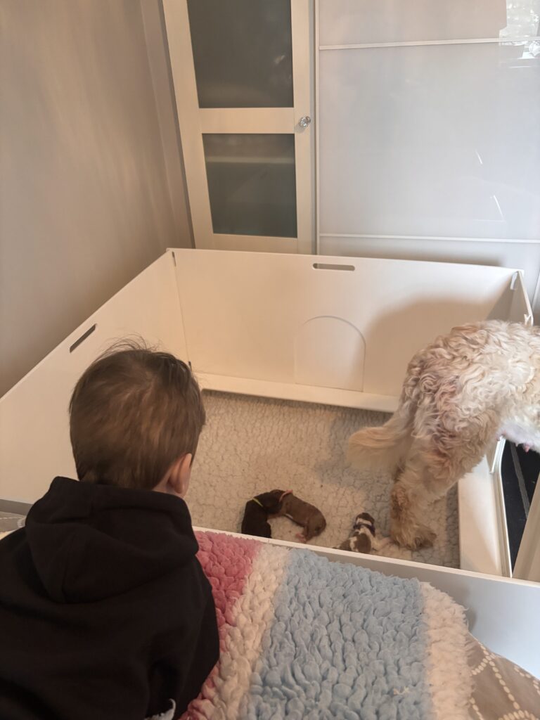 We expose our puppies to human touch from birth. We always consider the mother’s comfort level, as we don’t want to impose unnecessary stress on her. Nova stays nearby, watching over her puppies as they interact. This week, two of my grandsons visited to interact with Nova’s puppies. Sometimes, little hands aren’t so gentle—this serves as a teaching opportunity for children to learn to be gentle and to respect animals.