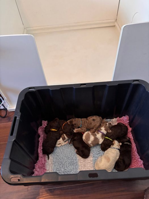 Newborn puppies are susceptible to disease. For this reason, we need to maintain a clean environment for them. We place the puppies in the basket while we clean and disinfect their whelping box.