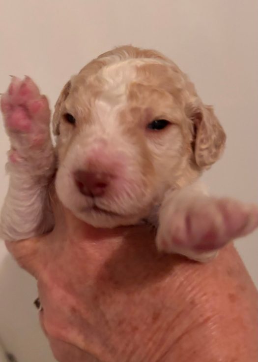 Another milestone was reached later in the week—eye-opening. The puppies’ eyes opened between Days 10 and 14. Our Pink Collar Girl was the first puppy to open her eyes on Day 10.