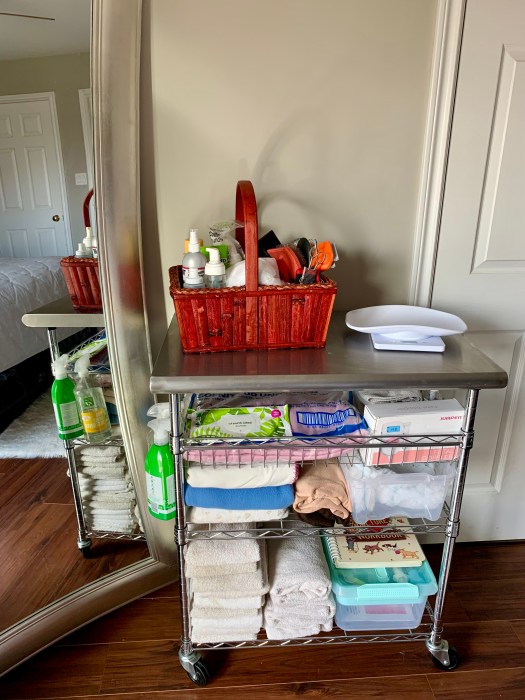 With two litters due together we needed two spaces for our whelping boxes. We set Willow’s whelping box in my bedroom and Ellie’s Whelping Box in another bedroom we use as our walk-in closet. I prepared my whelping cart with all our supplies and made sure everything would be ready. My “Whelping Cart” is on wheels making it is easy to move between the two rooms.