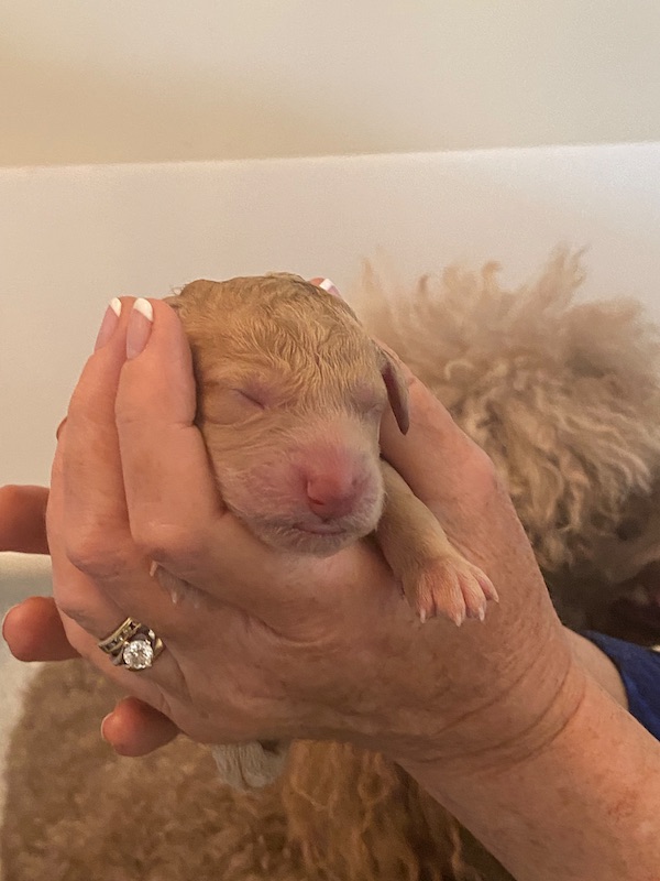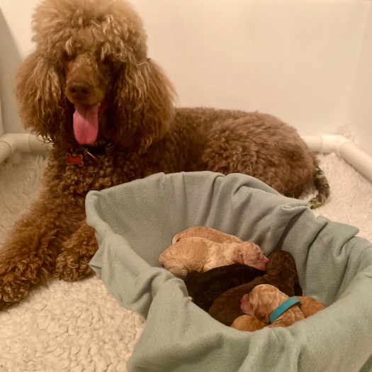 My plans for one litter went awry – Brinkley made his escape from my son’s house, crossed our main road and came back home to be with his sweet Ellie. The result – Two litters of puppies.