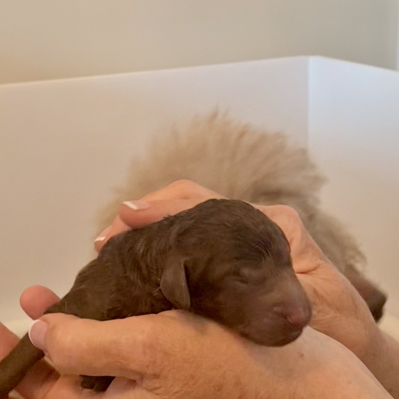 At 4:15 am, Willow delivered her last puppy – A chocolate merle weighing 378 grams.