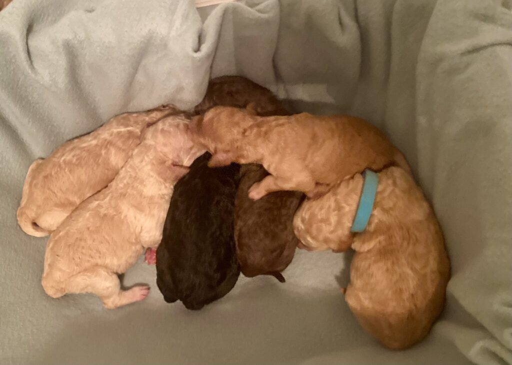 Finally, at 4:05 am, Echo’s first puppy arrived into the world. He was a beautiful black curly boy and she quickly tended to him. Echo is a third time mama and knows the ropes well. Her puppies started to come quickly and by 5:51 am, Echo had delivered a total of six puppies.