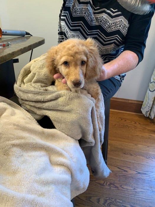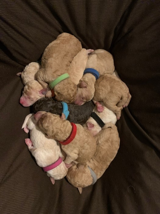 I know I have said it many times before but, going home time is bittersweet. Raising my puppies is a full time job for two months. When the puppies are in my bedroom, they are right beside me to care for if needed in the middle of the night. When the puppies are moved to the main floor, I have a night time routine. Before I go to bed I spend time in the puppy enclosure to hold and cuddle puppies. The night before they start leaving, I shed a few tears and hold them a little tighter. Lucky I am very busy preparing them for their forever families – no more time for tears; just the joy I share with the forever families when they come to pickup their sweet puppies.