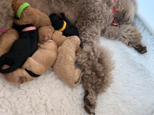 L.A. Doodles is excited to announce the arrival of Ellies’ puppies. Ellies’ labour started Sunday morning and she spent most of the time lying on my bed. As midnight approached, she became very unsettled, and I knew it wouldn’t be long. Her first puppy, a handsome boy arrived at 2:37 am and her whelping was completed three hours later at 5:36 am when puppy number eight arrived.